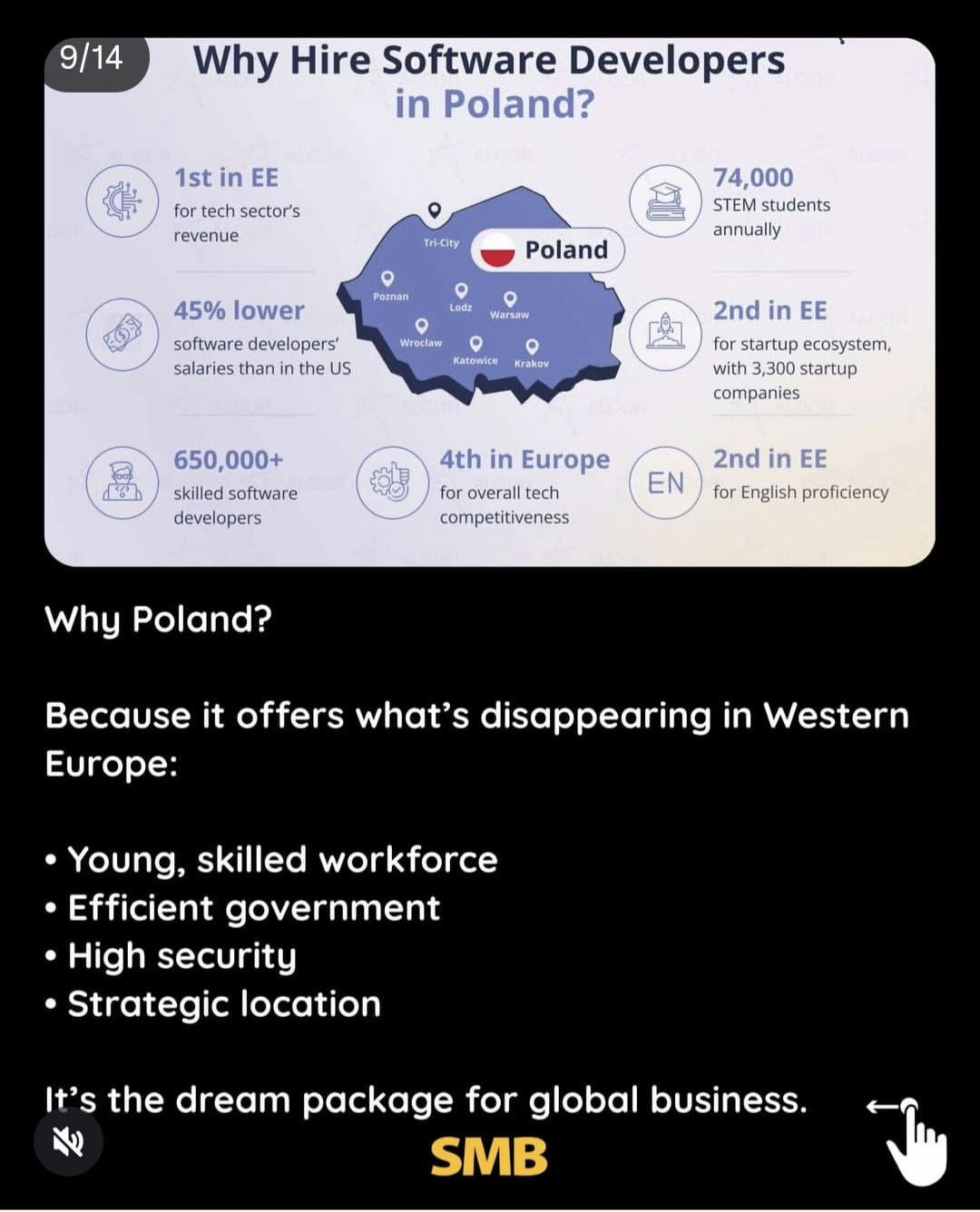 למה פולין? כי היא מציעה את מה שנעלם במערב אירופה:כוח עבודה צעיר ומיומןממשלה יעילהביטחון גבוהמיקום אסטרטגי