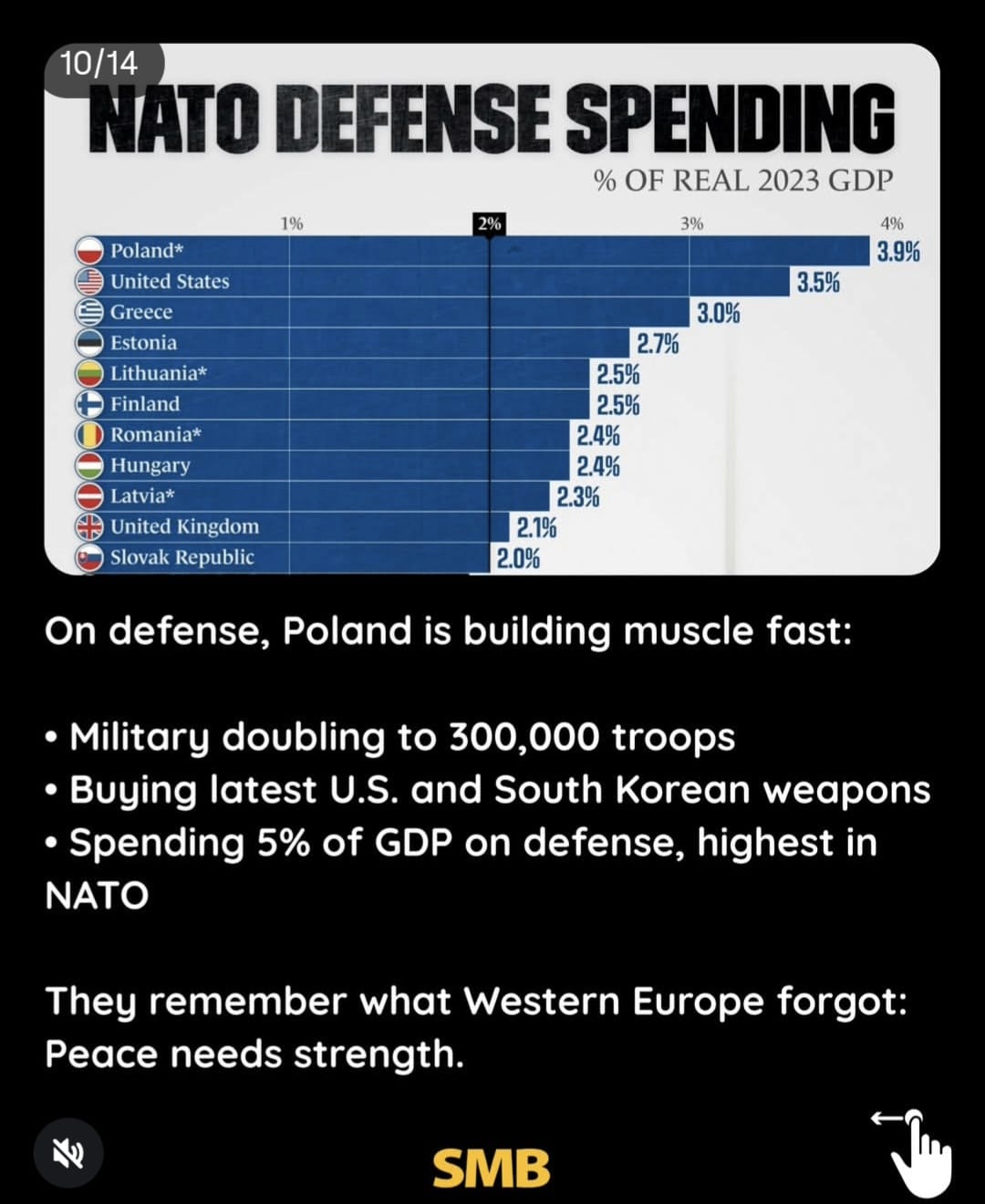 בתחום ההגנה, פולין בונה שרירים במהירות:הכפלת הצבא ל-300,000 חייליםרכישת כלי הנשק החדישים ביותר מארה"ב ומדרום קוריאההוצאה של 5% מהתמ"ג על ביטחון - הגבוה ביותר בנאט"ו