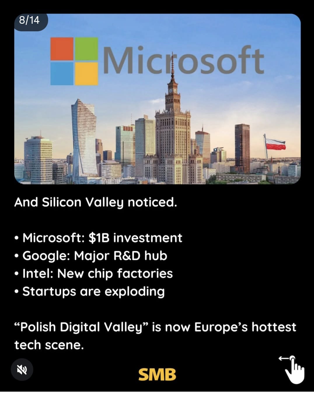 ועמק הסיליקון שם לב:מייקרוסופט: השקעה של מיליארד דולרגוגל: מרכז מו"פ (R&D) מרכזיאינטל: מפעלי שבבים חדשיםהסטארטאפים מתפוצצים"העמק הדיגיטלי הפולני" הוא כעת סצנת הטכנולוגיה החמה ביותר באירופה.
