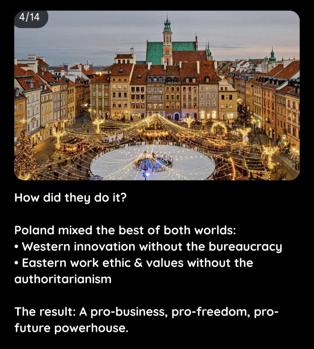 פולין שילבה את הטוב משני העולמות:חדשנות מערבית ללא הבירוקרטיהמוסר עבודה וערכים מזרחיים ללא האוטוריטריות (רודנות)התוצאה: מעצמה תומכת עסקים, תומכת חופש ופונה אל העתיד.